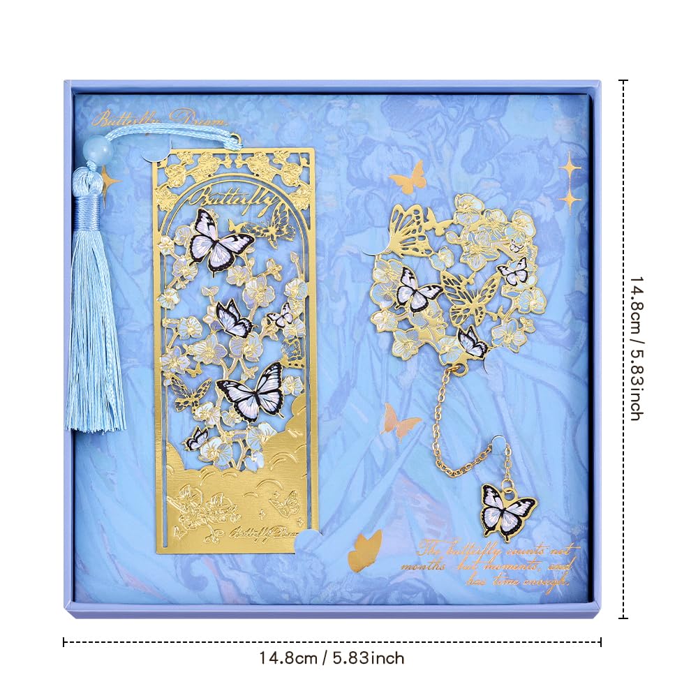 - 【Artistic Butterfly & Floral Bookmark】 Boasts an intricate and unique silhouette formed by blue butterflies and blossoms, complete with a delicate chain and a dangling blue butterfly charm.